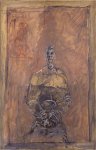 With their framework of thin black lines padded with flesh-tones, the painted portraits are drawings by another name. The only painterly passages are in the backgrounds, where a fug of smoky atmosphere envelops the sitter. Giacometti was not a face painter, he was a head painter focused on the skull beneath the flesh – the bulging, slightly thyroid eyes in his paintings emphasise the holes of the eye sockets. A cerebral artist, he views the head as a container for the brain. He grapples with its shape and position on the shoulders: craning forward like a figurehead in the sculpted busts of Annette from the early ’60s or screwed like a stopper on a sloping-shouldered bottle in the painted Bust of Annette (1954).