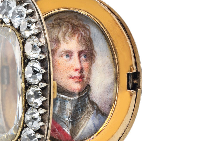 Now, on 6 July, Christie’s is offering the Maria Fitzherbert jewel, a memento of an even more extraordinary love affair. This was the no less tumultuous relationship between the Prince of Wales, later George IV, and Maria Smythe, the widowed Mrs Fitzherbert, who was a Roman Catholic and a commoner. After their initial meeting, the Prince became a man obsessed. Realising her unwillingness to enter into a liaison with him, and hearing that she was about to leave for the continent, in 1784 he took the drastic action of stabbing himself in the chest with a sword and sending his surgeon to say that he would tear open his bandages unless she came to his side. She obliged. At Carlton House, the Prince told her that nothing would induce him to live unless she promised to marry him.