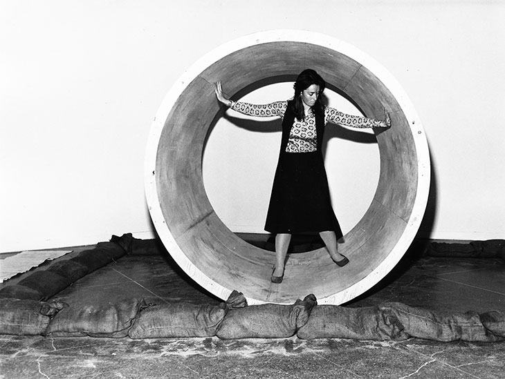 Morris was born in Kansas City, Missouri, in 1931. He moved to San Francisco in the 1950s where he studied at California School of Fine Arts and participated in movement workshops with Anna Halprin and met Forti, who also studied with Halprin. He and Forti hosted their own complementary workshops at their apartment, inviting poets, painters and dancers over to experiment with sound, lighting and movement. The couple moved to New York in 1960. There, Morris began building the simple plywood structures that would become central to early conversations about minimalism, all while helping Forti construct sculptural props for her performances. In 1961, Morris performed in Forti’s See-Saw, in which a man and woman ride an oversized see-saw — he read a magazine at one end while Yvonne Rainer screamed from the other. When the Judson Church on St Mark’s Place in New York became a performance venue, Morris and film-maker Robert Huot performed War (1963) there. Both made their own armour and weapons and ceremonially fought in the church basement. At the same time Morris built plywood boxes and grey painted polyhedrons, stark, pared down forms that aligned him with minimalist peers like Carl Andre and Donald Judd.