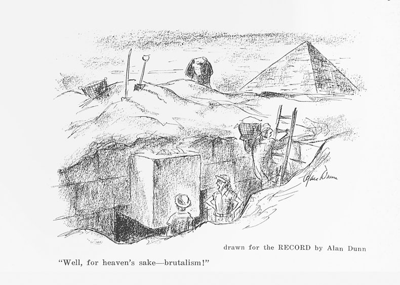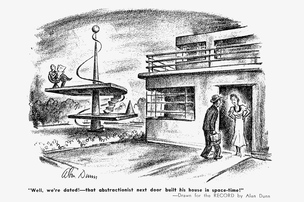 Dunn’s pulpit at Architectural Record gave him the chance to thoroughly explore these themes and in doing so he produced valuable criticism. His ‘abstractionist’ cartoon, besides being funny, suggested that functional modernism, rather than being an imperishable end of history, was just as susceptible to fashion as anything else. A later cartoon, showing a Corbusian ‘machine for living in’ abandoned and boarded-up in the forest predicts the ‘haunted house’ phase of modernism – and incidentally predicted the fate, for a time, of the Villa Savoye and other trailblazing modern homes.