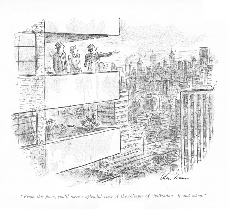 The one-liner seemed to come naturally to Dunn, although his gags had to pass through the New Yorker’s legendarily exacting editorial process, so often bore numerous thumb-prints; however this may be one of the few places where butterflies come off the wheel refreshed. His early cartoons could often produce a laugh from their caption alone. ‘Lady, I’ll be honest with you,’ asks a real-estate agent in one. ‘Where else in the world could you get a better view of 183rd street?’