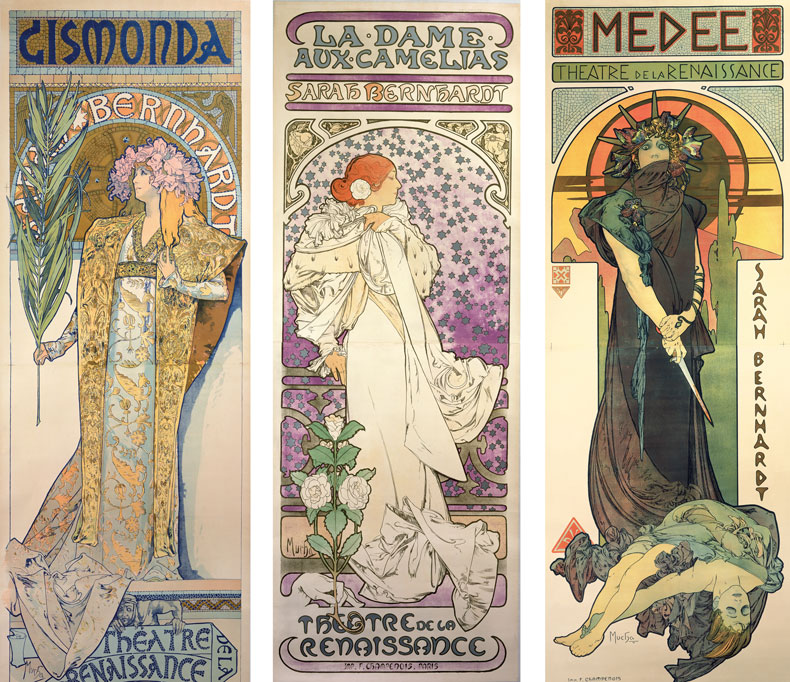 Three colour lithograph posters designed by Alphonse Mucha for productions starring Sarah Bernhardt: Gismonda (1894), La Dame aux Camélias (1896) and Médée (1898). Photos: © Mucha Trust 2024