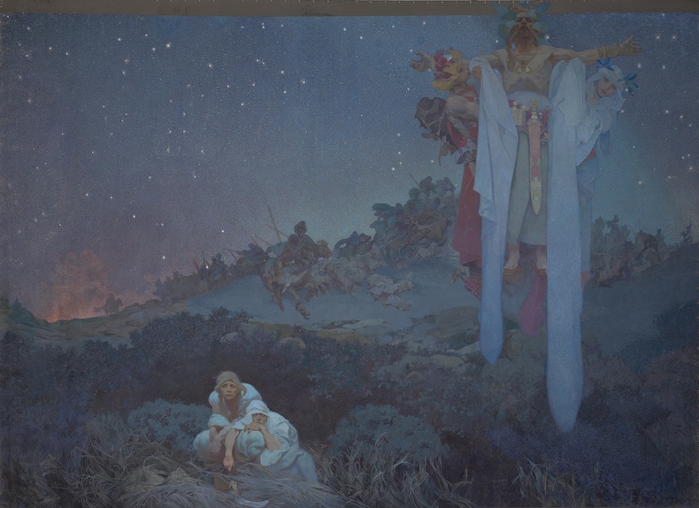 Reproduction of The Slav Epic I – The Slavs in Their Original Homeland Between the Turanian Whip and the Sword of the Goths (between the 3rd and 6th centuries AD) (1912), by Alphonse Mucha. Collection of the City Gallery Prague. Photo: © Mucha Trust 2024
