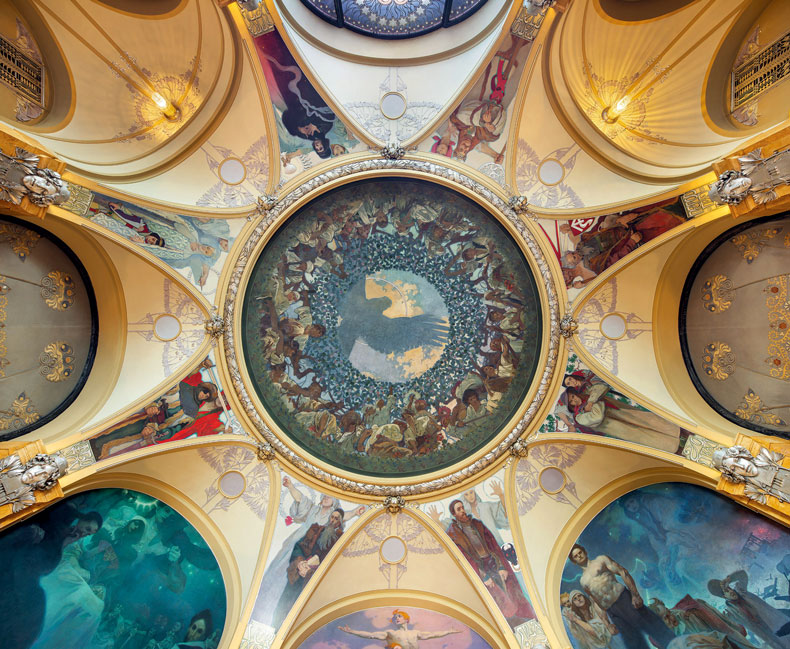 The ceiling of the Mayor’s Hall, decorated by Mucha in the 1910s, in the Municipal House in Prague. Courtesy Prague City Tourism; © Archiv Obecní Dům
