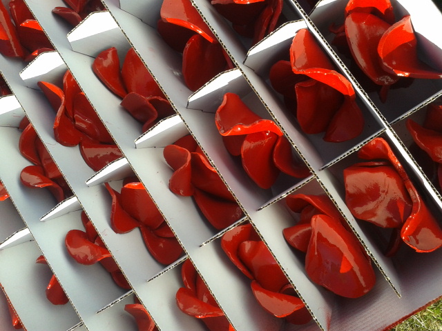 As a volunteer your time is repaid by the wonderful opportunity to interact with the installation, and each ceramic poppy is as appealing up close: powerfully red, painfully fragile, personal and unique. An introductory film explains how each flower has been hand-made by a team of makers, building the layers of petals together, and I was struck by how the installation manager stressed the material nature of each flower, their weight, and haptic appeal; how the act of planting should be reflexive. Each poppy relates to a life, and the project involves the touching act of returning all broken or misshapen poppies to the Derby workshop to be buried in a memorial site.