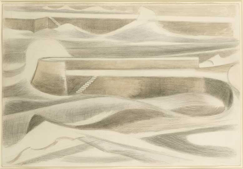 This balance between fluidity and tight design was not something I had fully appreciated in Nash’s work before, but it emerges clearly here as a stylistic preference curiously echoed in his choice of subjects. A remarkable number of the studies, for example, feature bodies of water. In his Dymchurch sketches jagged waves crash against an equally unforgiving sea wall with a violence that many have interpreted as reflecting Nash’s psychological state at the time (he suffered a nervous collapse in 1921). In a number of later landscapes the earth and sea seem to have resolved their differences: in Sea Wall (1935) they merge in a sinuous composition of muted browns and greys; Stone Sea (1937) traces the rise and fall of a dry stone wall over rolling hills; in Maiden Castle (1943), the ancient hill fort’s dug-out ramparts seem to break over themselves.