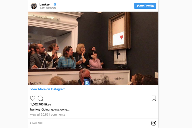 Banksy work shreds itself after selling for £1.4 million at Sotheby’s auction | A spray-painted work by the anonymous graffiti artist Banksy, Girl With Balloon (2006) shredded itself after selling for £1.4 million at Sotheby’s, London on Friday evening. The following day, the artist admitted to the stunt by posting a video of the events to Instagram with the caption: ‘The urge to destroy is also a creative urge – Picasso.’ The New York Times reports that bidding for the painting was between two private buyers, who collectively pushed the price to a new record high for the artist at auction. Sotheby’s has not disclosed the identity of the buyer but stated that they ‘are currently in discussions about next steps’.