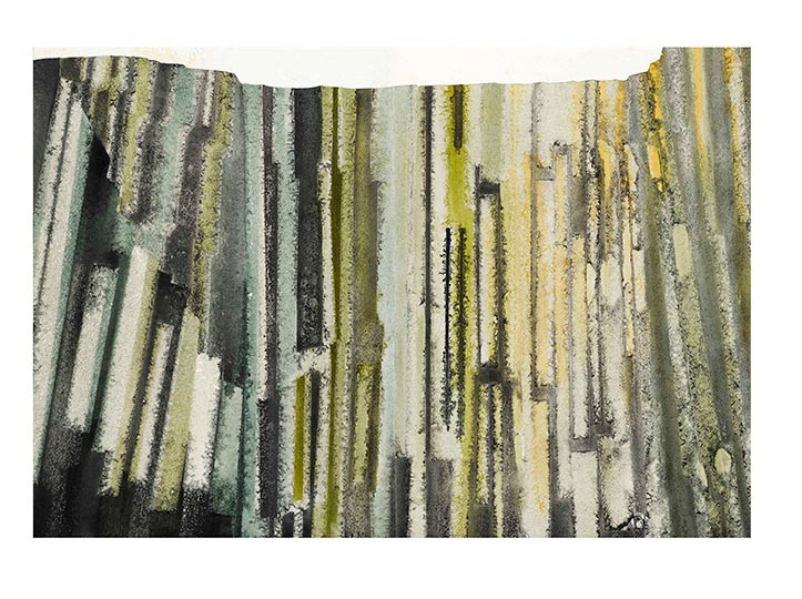 McManners’ watercolours have a strikingly sculptural quality, particularly for what is so often considered a lightweight medium. Their painted impact is hard-won: working on thick, textured Italian paper, she layers numerous washes of different transparencies onto the surface, scratching out highlights, lifting areas of paint and building up deep, impenetrable areas of indefinable near-black. Her titles are either architectural (cathedrals, curtain walls and buttresses) or musical (she works to rock music, and quotes her favourites), and suggest the spiritual and personal impact of the islands on her life and work.