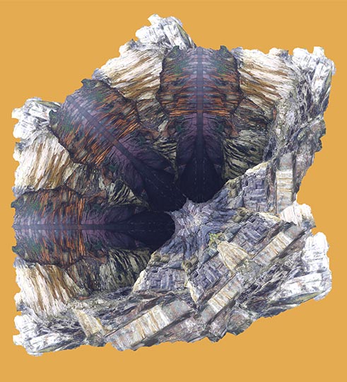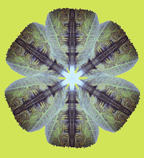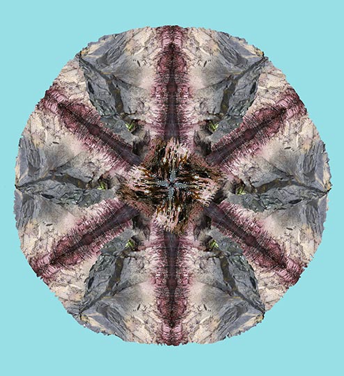 In an adjoining room, a series of prints constructed from photographs of the islands transforms them, from towering fortresses to self-contained, sinister flowers of hard stone. It’s here that the crystalline intricacy of the rock faces is best appreciated, isolated and celebrated in kaleidoscopic colours. A set of badges from the same series sit at the door to the galleries, ‘like pebbles picked up from a beach’, little mementos from a place of inhospitable beauty, to take with you into the cultivated, altogether more malleable gardens of St James’s Park.