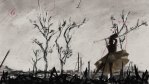 In the nearby EYE Film Institute in Amsterdam, Kentridge has an exhibition running until the end of August. It features another new work, which is also a kind of dance of death. More Sweetly Play the Dance (2015) is an imposing installation of large screens on to which a procession of silhouetted figures is projected; the background is the roughly charcoal-drawn bleak landscape around Johannesburg, with grey clouds sweeping overhead. A combination of drawn, cut-out figures and live actors, this pageant presents us with a band and church choir, prisoners carrying their own cages, figures carrying stencilled cut-outs of heroes or saints’ attributes, but also baths and typewriters, two floats of jiggling cartoon skeletons, floats pulled by labourers carrying local politicians and stenographers, and a troupe of Ebola victims trailing drips. They all process behind a figure who tears the pages from a book and are followed by a sole female dancer with a gun. ‘We are re-staging the procession of Plato’s figures in the cave,’ Kentridge notes in the catalogue. What we see is all humanity trudging behind worn-out creeds, bearing the costs of idealism, but also enduring, singing and dancing. As Kentridge says, ‘There is something utopian always about dance,’ even, terrifyingly, when the dancer carries a gun. While this work can clearly be read as an allegory of South Africa, it also resonates with Imperial parades, Saints’ Days and carnival processions across the world, political rallies and the despairing lines of refugees displaced by war, throughout the centuries.