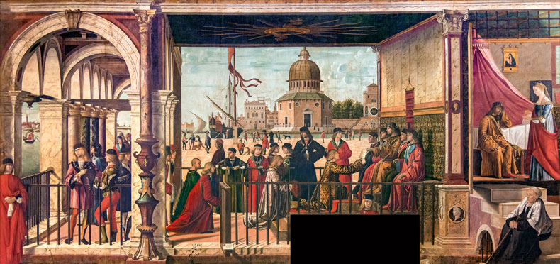 The same goes for the artist’s great cycle of paintings on the theme of Saint Ursula, now housed in the Accademia Gallery in Venice. Not even Carpaccio seems especially gripped by the Golden Legend narrative he’s apparently illustrating. What’s more interesting is what happens when you diverge from the main current of the story: duck into an alley between two fantastical buildings, take a snaking path up a hillside or squeeze through a jostling crowd of onlookers. The trick is to treat his paintings like Venice itself: to rove unhurriedly through his fictive streets and squares, to indulge in the pleasures of getting lost, allowing meanings to emerge by accident. It’s a dreamily distracted quality shared by many of Carpaccio’s characters. In the canvas titled Arrival of the Ambassadors, almost every face is looking listlessly away from the main event, the arrangement of the marriage of princess Ursula, daughter of the king of Brittany, to the pagan prince Etherius. And in the adjacent scene, in which Ursula is enumerating on slender fingers all of the conditions of their marriage, her father the king looks as though he’d rather be anywhere else but there.