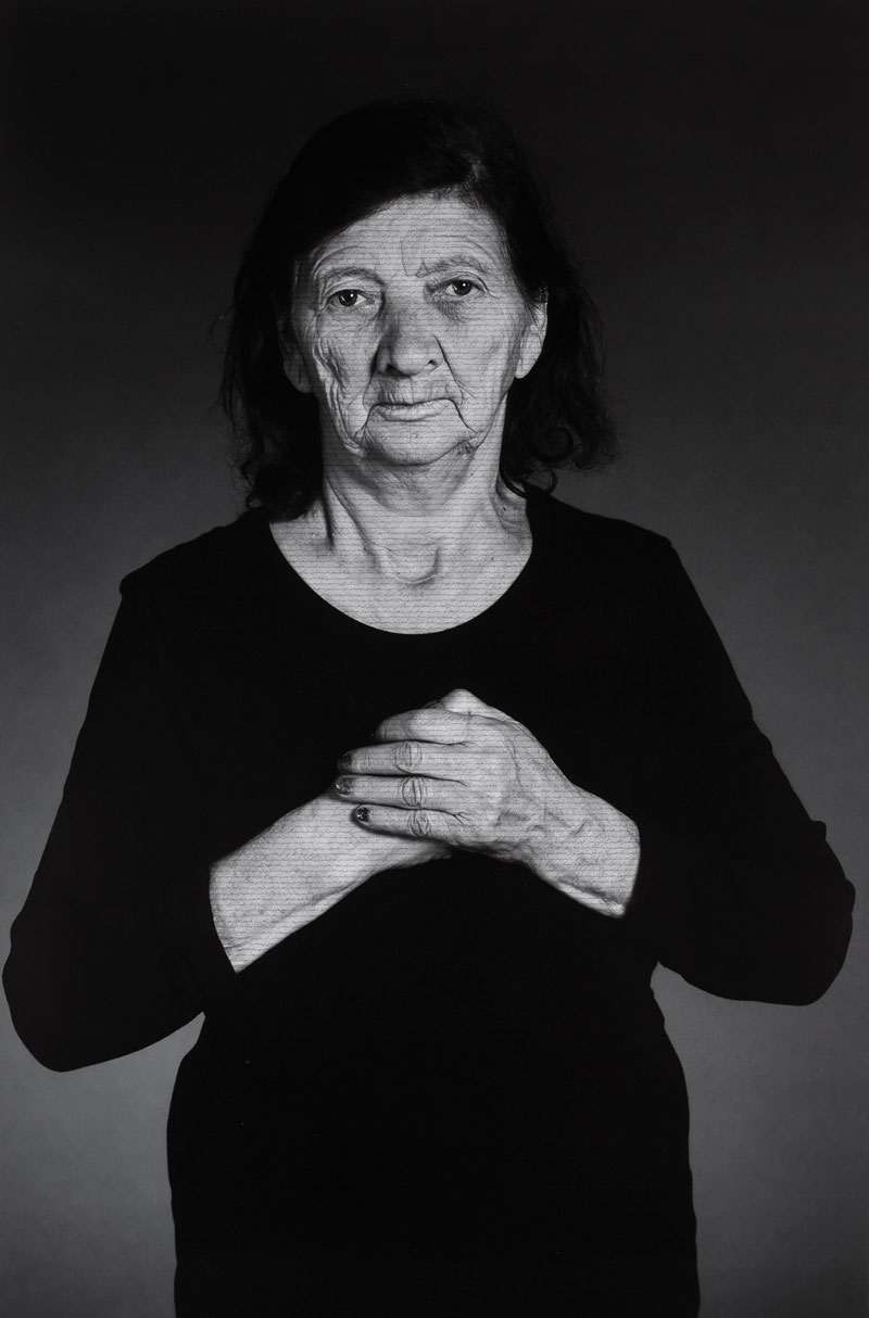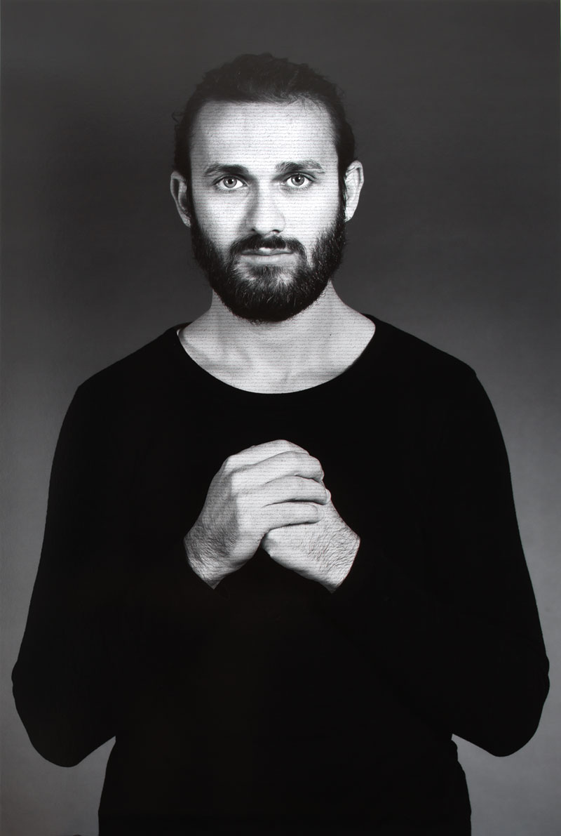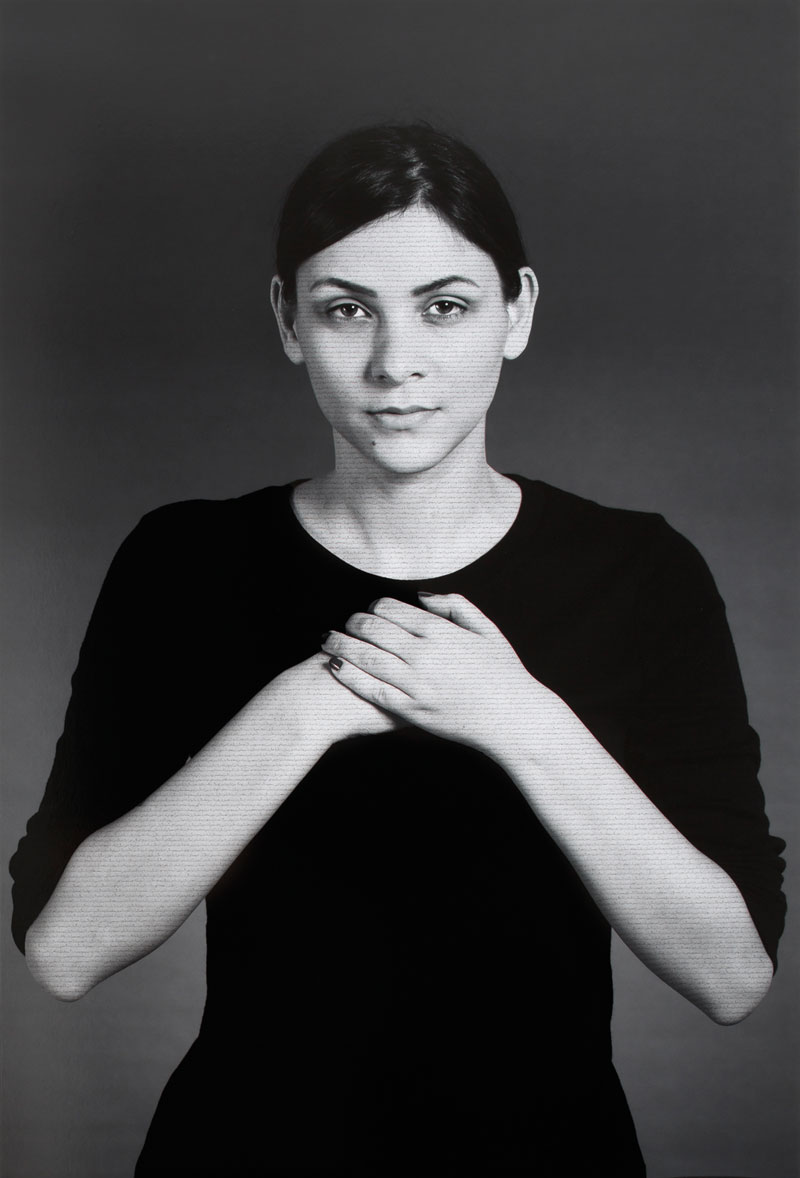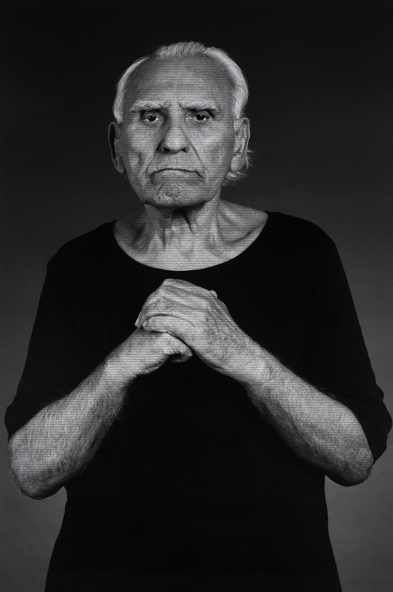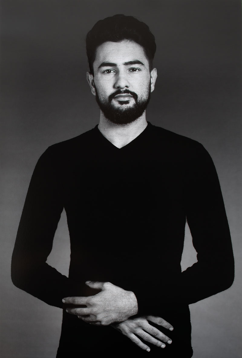 My subjects were Azerbaijanis of different genders, generations and ethnic backgrounds; some were students, others were workers, housewives with young children, grandmothers and so on. The process involved asking each individual several questions about the concept of ‘home.’ The answers were humble, spontaneous and honest. We took these answers in Azeri and Russian and translated them into English, then into my own language, Farsi, before inscribing them on each of their bodies on the surface of the portraits. In the end The Home of My Eyes became a tribute to Azerbaijan, but through my own personal lens and sense of nostalgia.