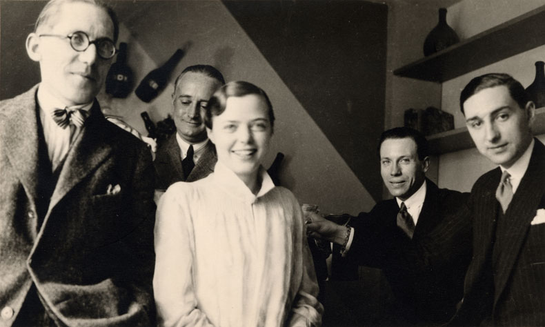 Le Corbusier, Charlotte Perriand, Djo Bourgeois, Jean Fouquet and Percy Scholefield in the Bar sous le Toit, photographed in 1928 by Pierre Jeanneret. Courtesy gta Archiv/ETH Zürich, Alfred Roth; © FLC, VG Bild-Kunst, Bonn, 2025