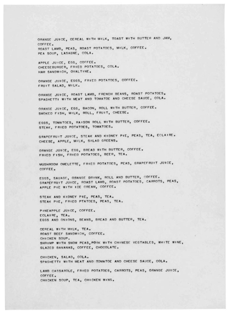 Christine Kozlov’s breakfast on 20 February 1969 consisted of eggs, bacon and toast (with butter and jam), polished off with a glass of orange juice and a cup of coffee. I know this because she recorded it – along with everything else she ate, from that morning up until 12 June – on 12 typewritten pages, titling the resulting work Eating Piece (2/20/1969–6/12/1969), Figurative Work No. 1 (1969). Recording things, making lists and performing repetitive actions were all very much a thing at the time. Kozlov’s friend On Kawara painted the day’s date on the same monochromatic background over and over again for nearly five decades. Joseph Kosuth, her classmate at the School of Visual Arts in New York, endlessly reproduced dictionary definitions on big black and white canvases, like an undergrad struggling to find an opening line for their coursework. But Kozlov took it to extremes.
