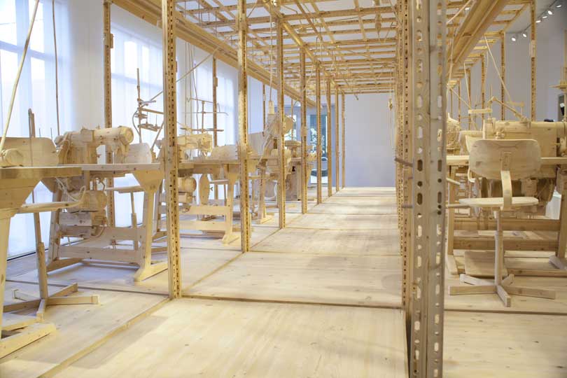 Wood, textile: complete sewing workshop made in wood, accompanied by floating figures in dark costumes.
