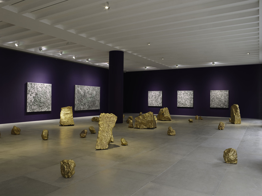 ‘With this exhibition, I wanted the viewer to feel like they’d entered a cave,’ Sodi continues, in fast and accented English. ‘We painted the walls deep purple because I wanted you to feel like you’d entered a mine with amazing stones and cracking walls.’ The effect is enveloping, and strangely royal in its colour scheme. Around the walls are seven of his large-scale, abstract canvases, each in rich silver with blue-green glitter accentuating the deep crevices that mark their visage. Scattered across the main floor space are tens of glinting, precious-looking golden volcanic boulders. The scattering of stones is similar to the organised scheme of a Japanese Karesansui, or rock garden, which uses carefully placed stones to mimic a natural landscape.