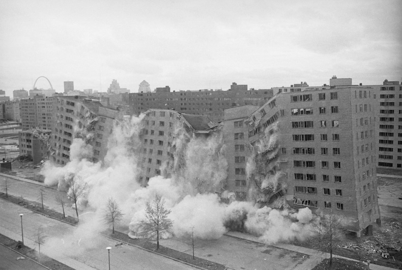 An 11-storey building in the Pruitt-Igoe housing project being dynamited on 21 April, 1972. Photo: Bettman via Getty Images