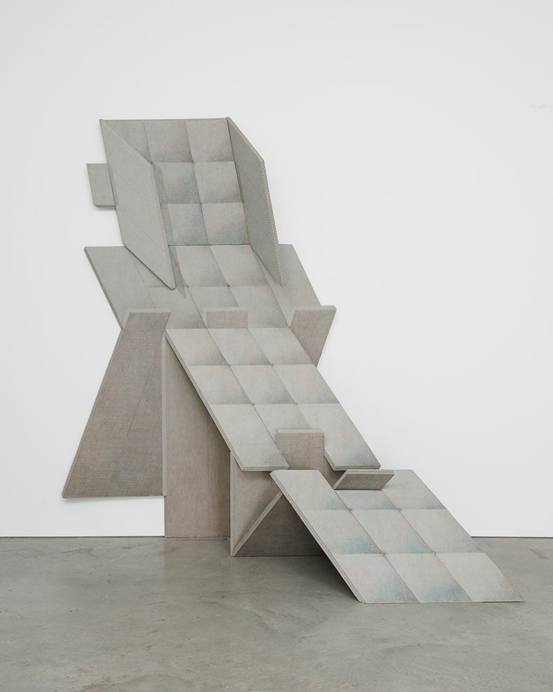 The high ceilings and herringbone-patterned parquet floors of the recently renovated Arts and Letters space provide an elegant backdrop for Simpson’s architectonic sculptures. The earliest sculpture demonstrates that straight out of graduate school Simpson had already achieved the alchemy she sought: transforming an ordinary, functional object such as a column into an abstract form. The column’s pleated surface suggests soft manipulation while remaining rigid and its skewed angles create a sense of spatial instability as you move around it. Simpson cut the interlocking cardboard pieces with a jigsaw on her dining-room table.