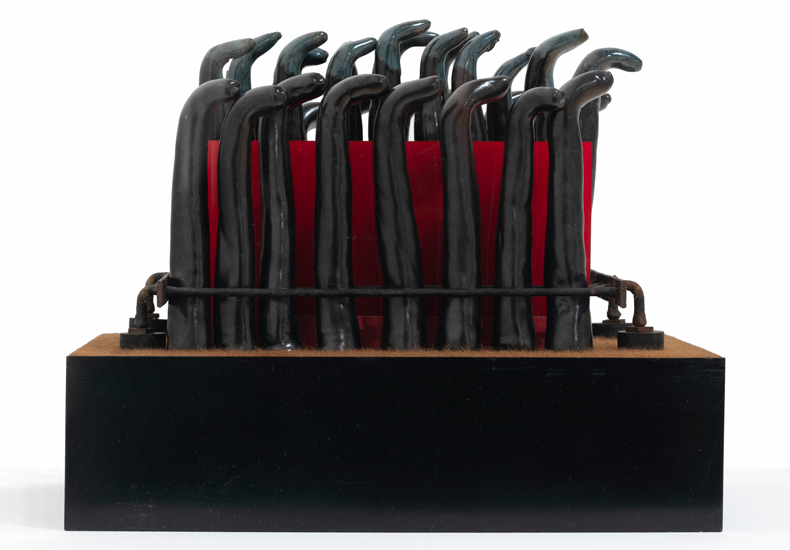 Donald Locke (1930–2010) was born in British Guiana and died in Atlanta, but he also spent a quarter-century in the UK. Having established a formidable reputation as a painter in Guiana, making paints from unusual ingredients and winning prizes for abstract work, he was awarded a scholarship to study ceramics in Bath at the age of 24 and went on to master a number of other art forms. Viewing his frenetic drawings, pared-back metal sculptures and large multimedia paintings side by side, it’s hard to believe that they came from the same hand. This retrospective, which began in Bristol and moved to Birmingham last year, is now opening in its final version in London (10 April–30 August). On display are a number of works that weren’t included in the exhibition’s two previous editions, such as ceramics made in the last decade of Locke’s life and a series of works on paper from the 1990s that combine collaged images with impassioned mark-making.