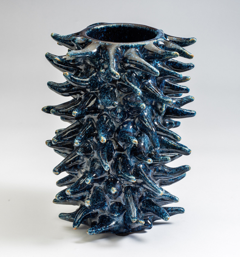 Here are some words I wrote while inside that black box: pine cones, breadfruit, hernia, sea anemone, flayed flesh, goat’s udder, pile of snakes, guts, bramble thicket, horns emerging, insects hatching, non-human reproductive organs (gastropod?). The magic is in Salto’s allusive skill. The more literal and figurative a vessel is, the less successful. A blood-red vase embellished with a Medusa’s head lapses into kitsch, as does another adorned with a life-size sculpture of a lizard.