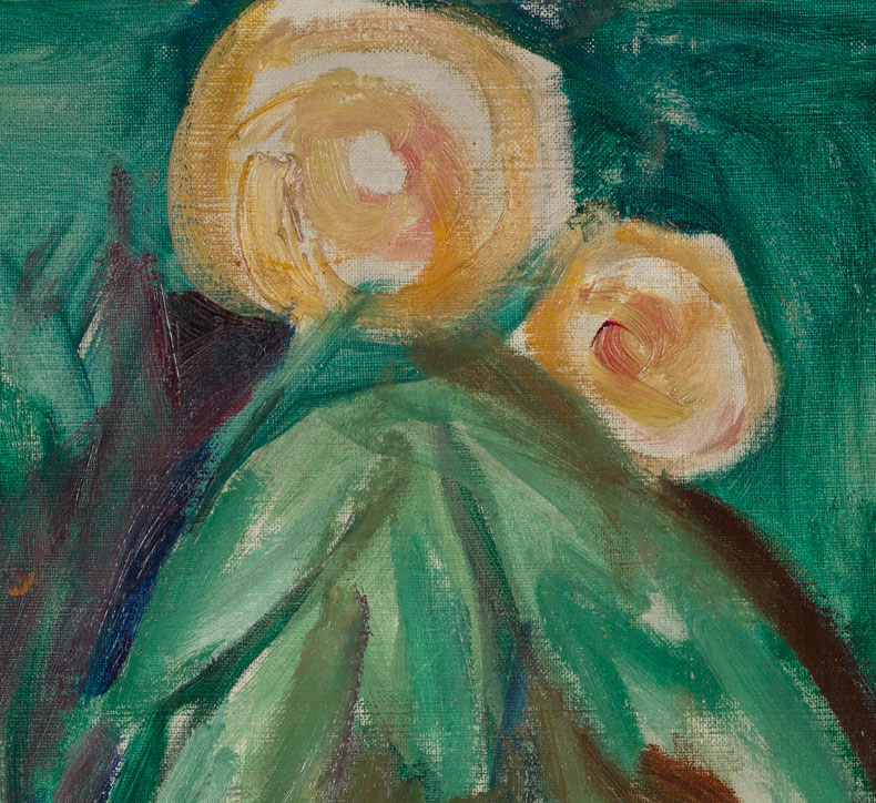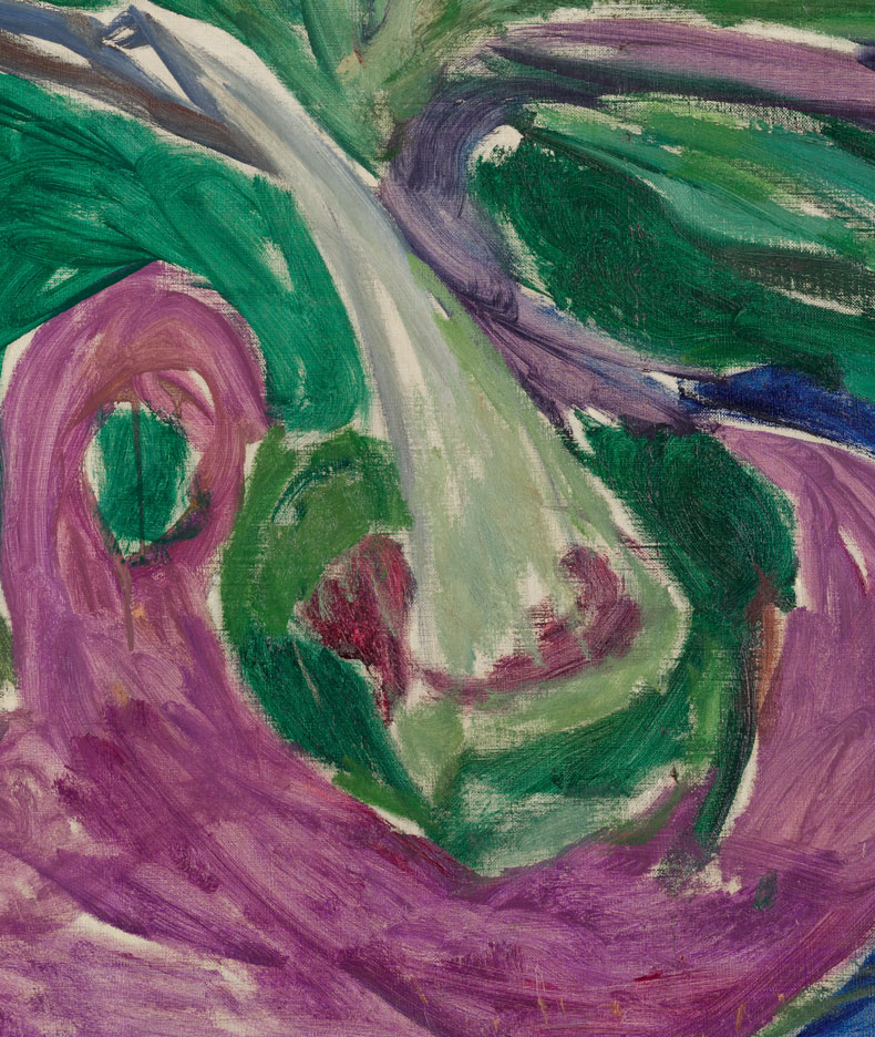 The setting is clearly a garden of some kind, but there is no perspective, no view to anything outside. The combinations are strange: there is an approximation of a waterfall on the top left of the canvas, while the two tree-like forms could be anything. Munch had long been interested in sunflowers – particularly when he was painting the Reinhardt Frieze in 1906–07 – and these could well be sunflowers. Then there is a really strange flow of luminous fuschia spiralling across the bottom, which could represent water or perhaps the fertility of the soil. That colour is still shocking to the eye nowadays, though in Munch’s day it would have been even brighter. These paintings, which have resided at the Freia factory canteen for more than a century, have been dulled over the years probably due to being exposed to nicotine and cacao residue; they have been cleaned several times over the past century.