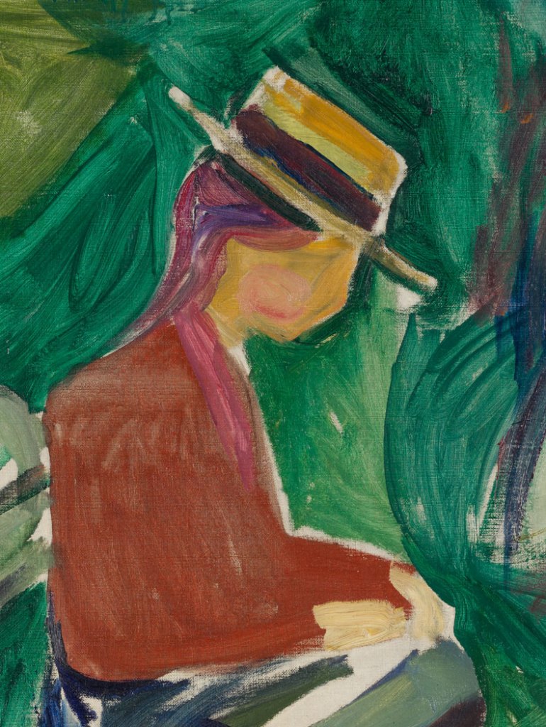 This particular painting, Frieze number IV (Girls Watering Flowers) is the only one without the sea in it. It’s a very interesting painting because it looks quite different to all the others. It is a garden scene, with two women watering plants enclosed by lush natural surroundings. The eye is drawn, naturally, to the women, dressed in colourful clothing. Their colouring and composition were borrowed from an earlier painting by Munch from the Linde Frieze, which was commissioned in 1904 by the physician and friend of Munch’s, Max Linde, who wasn’t happy with what Munch had turned out and gave most of them back to the artist. Many of the Linde panels were painted in Åsgårdstrand too, and the figures in those friezes are mostly based on the girls from the village. It is fascinating to see Munch’s sketches for the men’s canteen – also on display in this exhibition – because they are entirely different to these harmonious visions. Those were very much focused on strong men leaving the factories or groups of workers walking the streets of Kristiania (today’s Oslo). The 1920s was an important time for workers’ rights in Norway – with the right to summer holiday, an eight-hour working day and the right to demonstrate on 1 May introduced. Munch was not generally an outspoken political artist but he did express solidarity with workers, who he tended to think of as perseverant men, like himself.