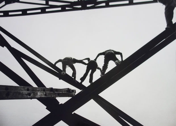 In one shot from 1972, a car has skidded to a halt following a crash, and a crowd has subsequently gathered around the mangled steel chassis in such a way that it seems the car skidded through the pedestrians, parting them until it couldn’t go any further. People look up intently at Metinides’ watching lens. In an image taken at Xochimilco Lake in 1960, another crowd has formed to watch a dead body being retrieved by a lifeguard. They can be seen in the reflection on the water, gathered along the shore. In a series of three photographs from 1971 the focus is on a figure balanced precariously, high up on the frame of a building under construction. The first image shows the figure alone, at the joint of some girders shown bold and black against the sky, like a Rodchenko or Renger-Patzsch print. As the images progress, two other figures make their away along the girders towards the central figure, who the caption explains had climbed up to jump to his death.