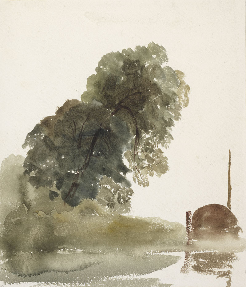 You might enter this exhibition expecting a rare view of masterpieces from the golden age of British watercolour – from Alexander Cozens, perhaps, to Joseph Mallord William Turner. Instead it opens with Bright Cloud by Paul Nash, from 1941. In this astonishing picture a white cloud rises, looming, blooming, above a thinly sketched landscape of trees and mountains, its presence intensified by the surrounding bright blue sky. Nash’s work is an homage to the visionary painter, Samuel Palmer, whose warmly coloured, richly symbolic work The Magic Apple Tree (c.1830) is another highlight of the show. Bright Cloud is also a virtuoso demonstration of watercolour’s strengths. His facility in capturing the fleeting effects of nature is matched by the potential of thin washes to suggest a dream-like world coloured by mood and fantasy. Spontaneity is balanced by precision.