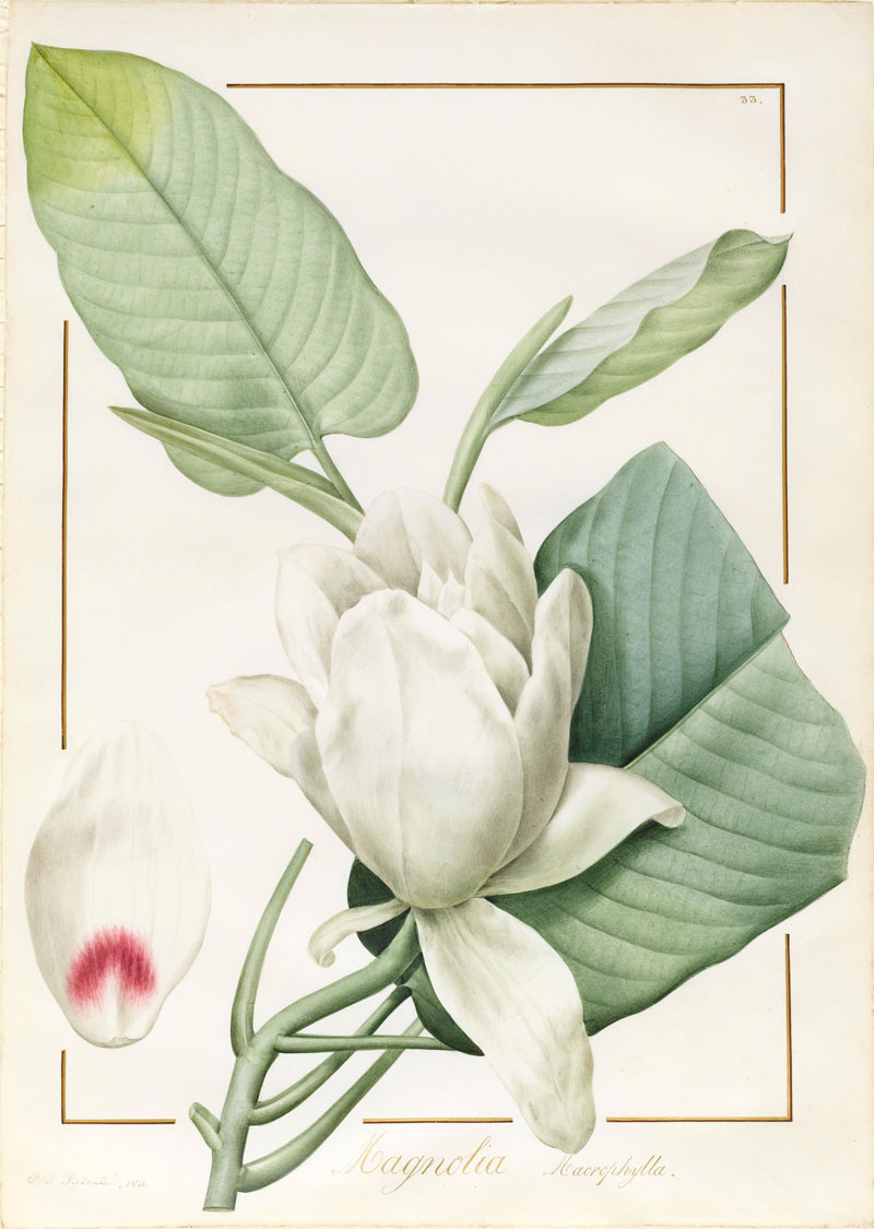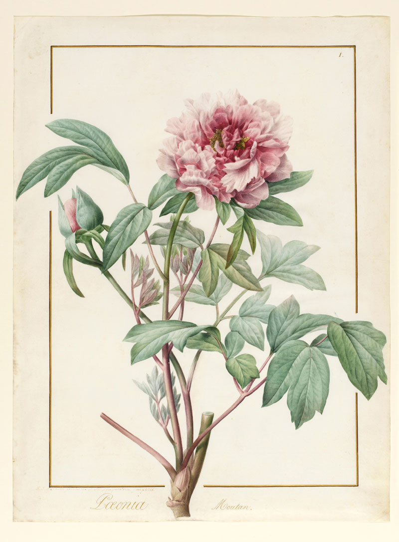 Botanical drawing was another genre dominated by watercolour. Two magnificent flower paintings on vellum by Redouté – one of a magnolia (1811), the other of a peony (1812) – rise far above mere documentation in the subtlety and freshness of their execution.