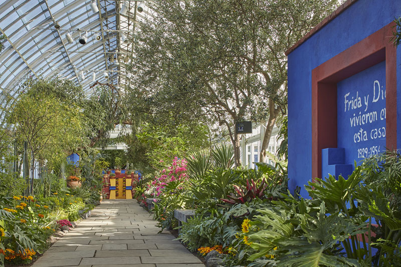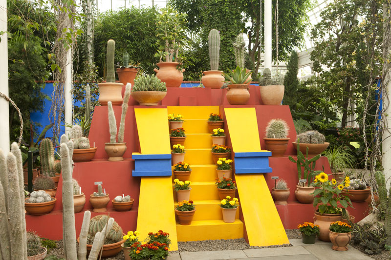 In the gardens, paths through towering tulip trees in full blossom, then the conifer arboretum and almost every variety of peony, lead to the expansive Haupt Conservatory. Here, amid exotic tropical flowering plants such as the jade vine, a large chunk of Frida’s Casa Azul garden has been recreated together with her studio desk with paints and brushes at the ready. Never have cacti looked so beautiful. NYBG’s summer ‘Frida’ programme includes Mexican plant tours, music, film and ‘Frida al Fresco’ evenings. In the gardens, Mexican plants are given special ‘Frida’ labels and plant-mentioning poems by Octavio Paz are pinned up on banners in shady spots.