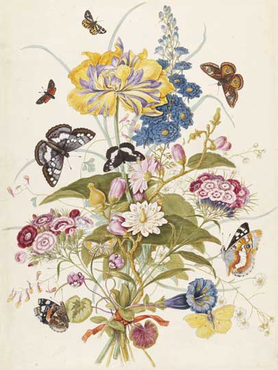 ‘From Root to Tip: Botanical Art in Britain’ is in no way as comprehensive as the title implies. It’s a small gathering, but it hints how flower paintings might inhabit various genres. A typical title gets the point across: a 1769 work by Thomas Robins the Elder is called A bunch of ornamental flowers tied with a ribbon, surrounded by moths and butterflies. Here we have picking, polite arrangement and the suggestion of a gift – bordered by insects which may or may not be attracted to these flowers in nature.