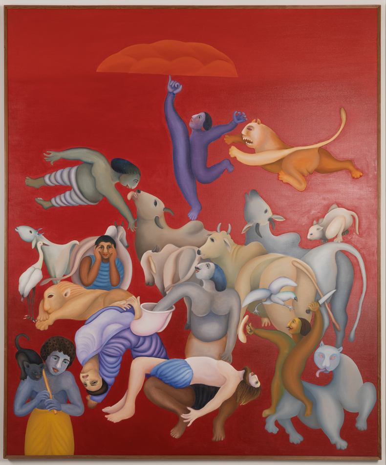 Manjit Bawa’s vivid painting teems with life. Against a deep red background, the artist weaves together Hindu mythology and Sufi mysticism into a single dense composition where animals and humans coexist, sometimes peacefully, sometimes violently. Bawa grew up among cattle and other farm animals in Punjab, approaching bulls fearlessly and incorporating them into his art as symbols of harmony between humanity, nature and the divine – though here that harmony appears precarious. Click here to learn more.