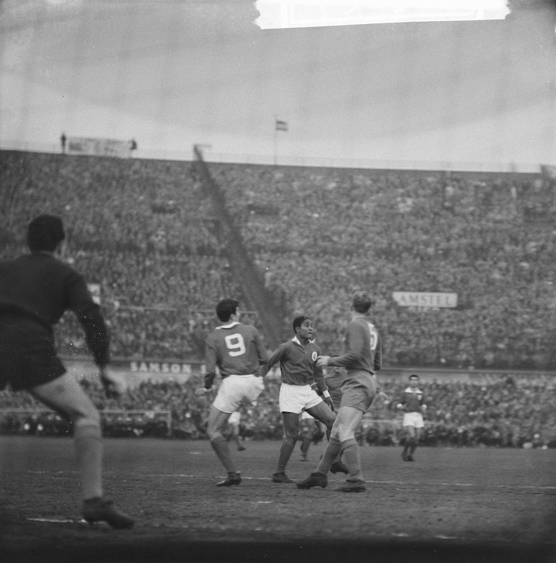 This is a snapshot of one of the most celebrated European cup finals in football history, when Benfica overcame Real Madrid 5–3 in Amsterdam’s Olympic Stadium. Despite Real Madrid’s early lead, the Portuguese side rallied, with Eusébio scoring the two final goals before 65,000 spectators and a television audience of 100 million. The image captures Eusébio in a moment of intense concentration, his eyes fixed on the ball, which is outside the frame. Click here to find out more.