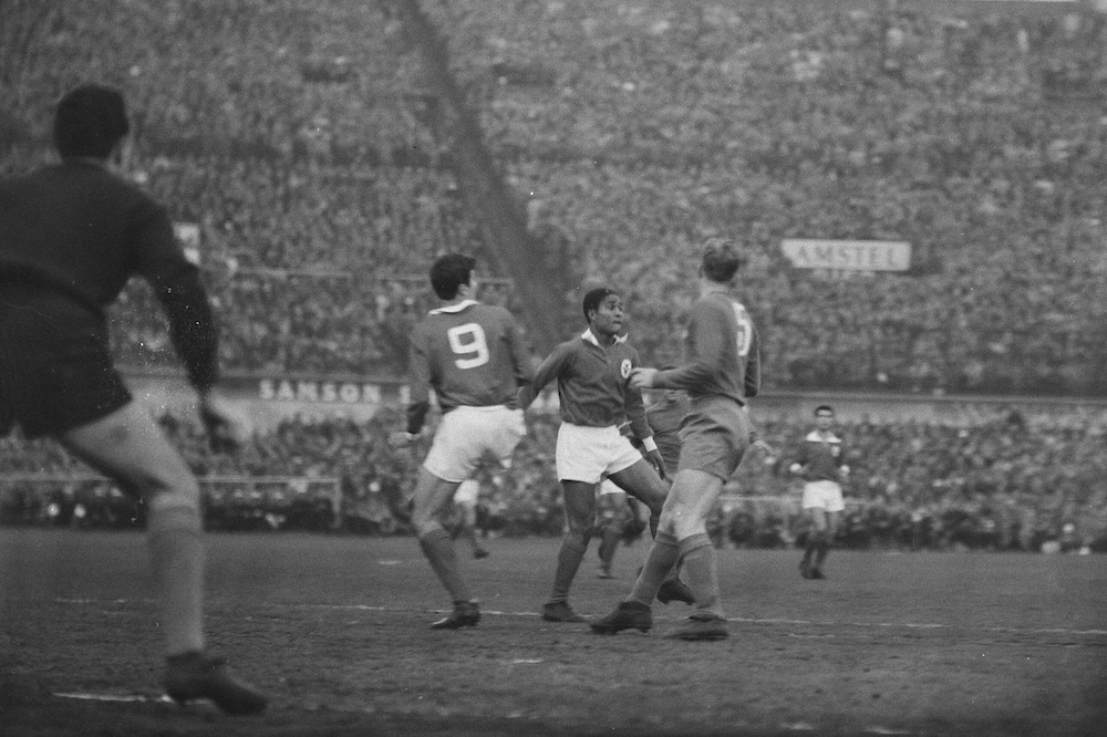 This is a snapshot of one of the most celebrated European cup finals in football history, when Benfica overcame Real Madrid 5–3 in Amsterdam’s Olympic Stadium. Despite Real Madrid’s early lead, the Portuguese side rallied, with Eusébio scoring the two final goals before 65,000 spectators and a television audience of 100 million. The image captures Eusébio in a moment of intense concentration, his eyes fixed on the ball, which is outside the frame. Click here to find out more.