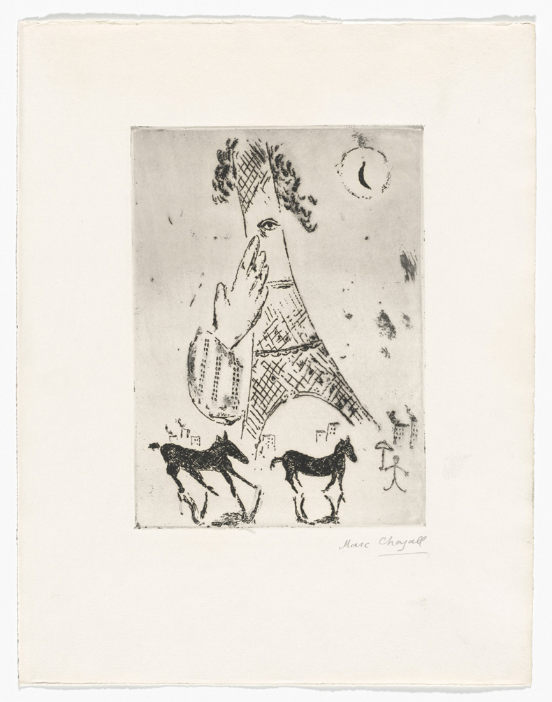 Eiffel Tower, from VVV Portfolio (1942, published 1943) by Marc Chagall. Museum of Modern Art, New York. © 2026 Artists Rights Society (ARS), New York/ADAGP, Paris