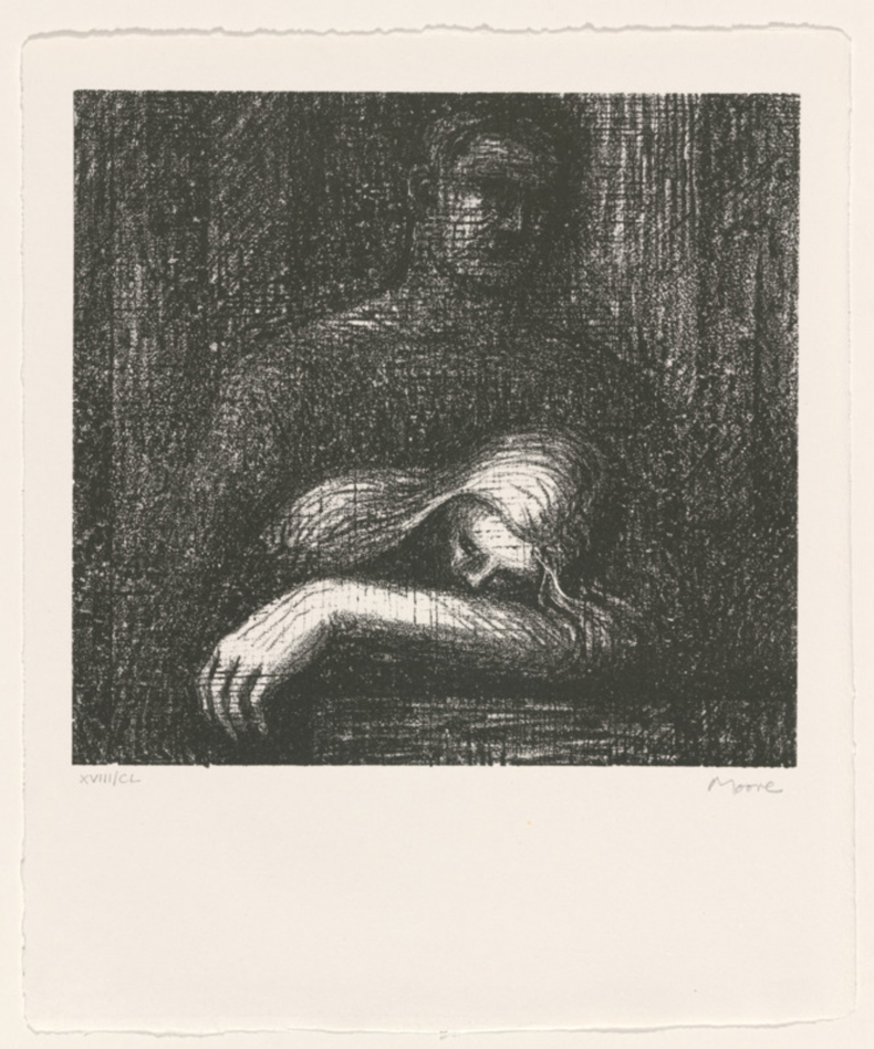 Henry Moore’s lithograph abstracts a head in repose into smooth, organic contours and subtle shading, the sleeping figure reduced to its essential curved forms. Created as part of a portfolio that paired W.H. Auden’s poems with Moore’s prints, the image captures the serene surrender of sleep, echoing Auden’s tender line: ‘Lay your sleeping head, my love, / Human on my faithless arm’. Moore’s lifelong fascination with reclining and horizontal figures found perfect expression in the human form at rest. Click here to learn more.
