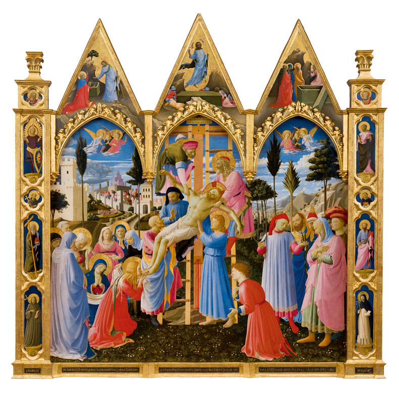 It opens with the beautifully restored Deposition, a painting begun by Lorenzo Monaco – who delivered only predella and pinnacles – and finished by Fra Angelico. The curators foreground his reimagining of the triptych into a single pictorial field. The friar seized opportunities for spatial exploration that Lorenzo Monaco did not pursue in the Annunciation for the Bartolini family chapel for the same church. The comparison also reminds visitors that Lorenzo Monaco modelled the career of a painter who embraced the religious life and successfully leveraged the connections and independence of the orders, which operated outside the guild system. Another approach to carving out a modern vision within the antiquated triptych format surfaces in the next room. Here the triptych for the chapel of the Compagnia di San Francesco del Martello at Santa Croce stands out. With laser cleaning technology, conservators at the Opificio delle Pietre Dure have made the side panels, long thought to be damaged beyond repair and consigned to a storage depot, shine again. Reunited with its central panel and predella, the main tier of images reveals Fra Angelico’s careful use of landscape already introduced by the Deposition. The same spare desert beneath the saints’ feet that underscores the Franciscan commitment to a penitent life creates plausibly three-dimensional space in front of the gold background, transforming the four ascetics into figures in the round. In the predella, Fra Angelico took those spatial experiments further, opening a bird’s-eye view behind The Meeting of Saints Dominic and Francis of Assisi and plotting a tightly framed and choreographed crowd scene in the central panel depicting the funeral of Saint Francis.