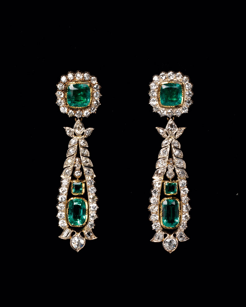 The gold and silver would be sourced, melted down, alloyed and rolled out on to a thin sheet with wire to make the structure and the settings. Then the goldsmith would make a little collet and decorative elements by hand, soldering everything together and adding hinges and links so that the piece would hang properly, or screws so the pieces could be taken apart and worn in different ways. A specialist setter would prepare the seats for each of the stones and then carefully set the diamond and, in this case, the emeralds. Once set, the whole piece would be polished and cleaned, and a box created for the jewels, velvet-lined and furnished with a mount so that they sat in the case perfectly.
