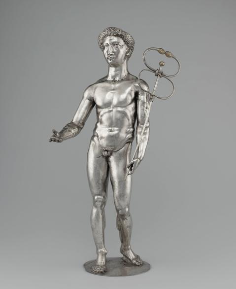 In 1830, a French farmer stumbled upon an exceptional hoard of silver-gilt statuettes and vessels while ploughing his field near Berthouville. The group, which includes some of the finest examples of ancient Roman silver yet discovered, was dedicated to Mercury – decades after the original discovery, a sanctuary to the Gallo-Roman god was discovered at the same site. Soon after it was found, the Berthouville Treasure was acquired by the Bibliothèque nationale de France in Paris, where the items were cleaned and, in some cases, reassembled. But the corrosion that resulted from the objects long burial proved difficult to repair, and the 19th-century restorers left their own marks, using solder, beeswax and resin on the items.