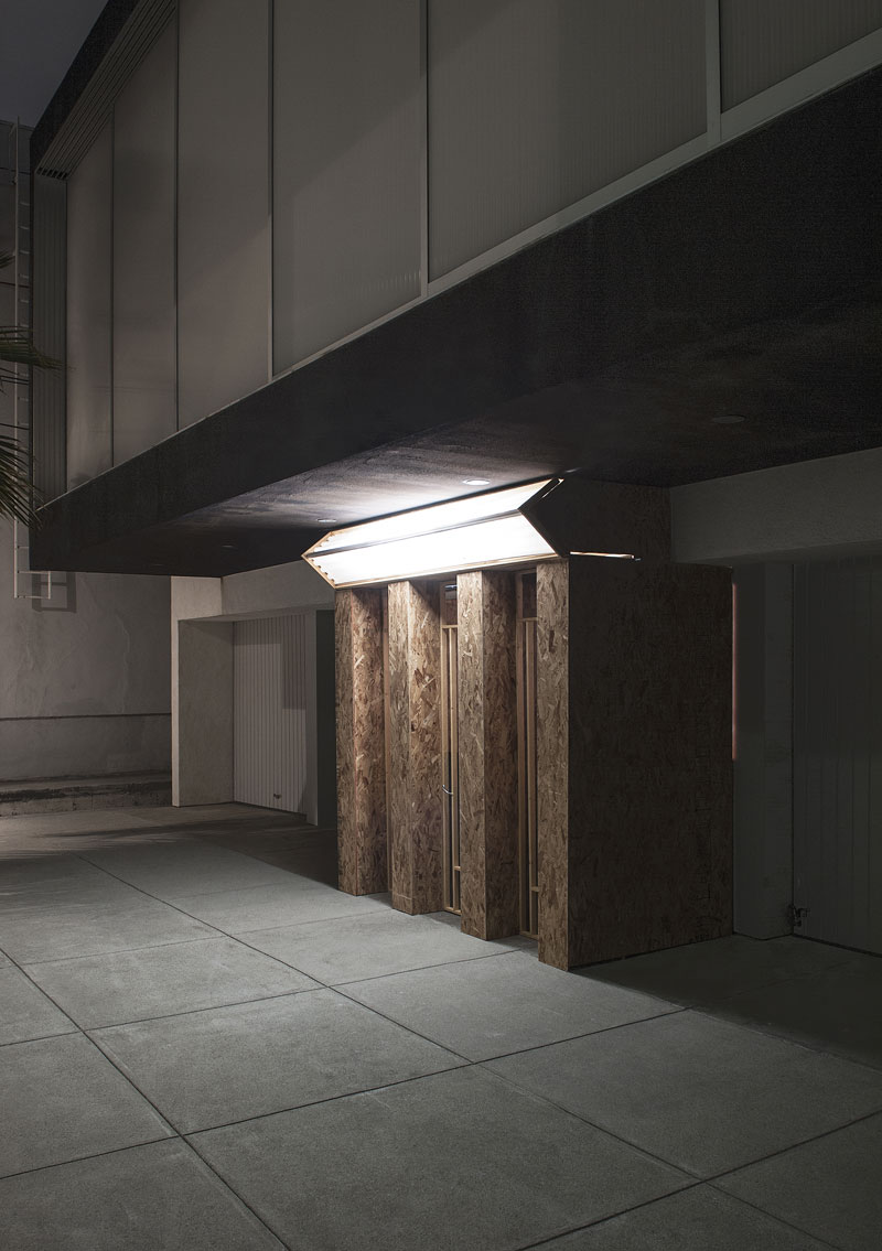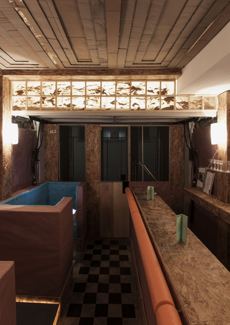Los Bar, a project by Andreas Bauer, Christoph Meier, Robert Schwarz, and Lukas Stopczynski, is an almost-to-scale replica of Adolf Loos’s iconic American Bar in Vienna. It occupies one segment of a six-car garage in the Mackey apartments, designed by fellow Austrian modernist architect Rudolph Schindler. The original Loos bar is a paragon of refined simplicity: Loos’s attention to material finish and simple, boxy geometry created an intimate space replete with red marble, onyx, mahogany, and wraparound mirrors. The bar still earns its name with a steady jazz soundtrack, white-coated bartenders, and a menu of stateside classics like Highballs, Whiskey Sauers, and Manhattans. Los Bar doesn’t offer quite as many options – no cocktail muddlers or lemon twists here – but the artists do take turns serving gin, whiskey, tequila, vodka, and beer. For sturdier guests they’ll mix a kitchen sink combination of them all, delivered in a glass glued to a heavy concrete plinth.