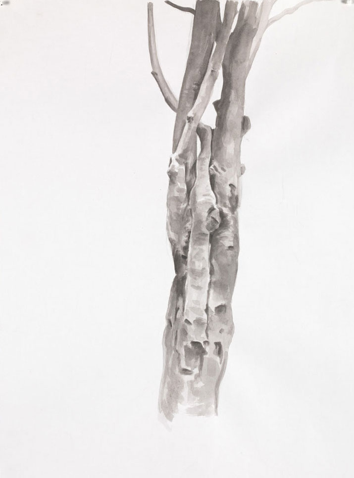 The vandals who presumably left the used cans in The Tree of Whatever (2015–16), the old tarpaulin in The Living and the Dead (2015–16) and the phallic graffiti in The Old Master (2015–16) had little respect for these trees. The same is not true of Shaw. Captured in a dingy twilight, his trees are not especially stunning, but the artist revels in the rich details of their branches; their texture, their crevices, and the twists of their unpredictable forms. His ink studies for Verso (2014) and Recto (2014) not only magnify their lumps and bumps, but also explore how the light subtly reflects off their bark. The trees in Study for Hanging Around (Landscape without Figures) (2014) have an ethereal quality, too. Set against a cool, pale sky, their leafless branches twizzle out with alluring delicacy. Shaw outlines the trees clearly, but he also allows long drips of ink to dribble down the paper, reminding us that this is a painting and these trees are unreal.