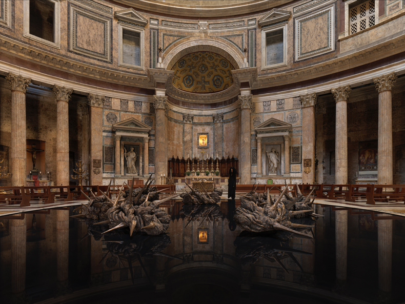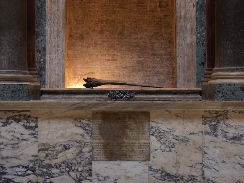 At the centre of the installation stand seven hand-modelled fragments of a crown of thorns, cast in bronze and finished with a patina created specifically for the Pantheon called Antika Romana. The sculptures are arranged around a circular water basin that mirrors the proportions of the oculus of the dome, thereby embedding the work in the architecture around it. The still water becomes the source of a double reflection: it mirrors not only the bronze fragments but also the light of the oculus revolving above it. Images of heaviness and lightness, pain and hope, converge in the eye of the beholder. ‘People are deeply moved, lingering at length before the sculptures and allowing both the installation and the space to resonate within them,’ wrote art critic Friedhelm Mennekes, SJ, consultant for contemporary art at the Pontifical Council for Culture. In other words, Corona Gloriae transcends the purely visual and becomes a physical, spiritual experience.