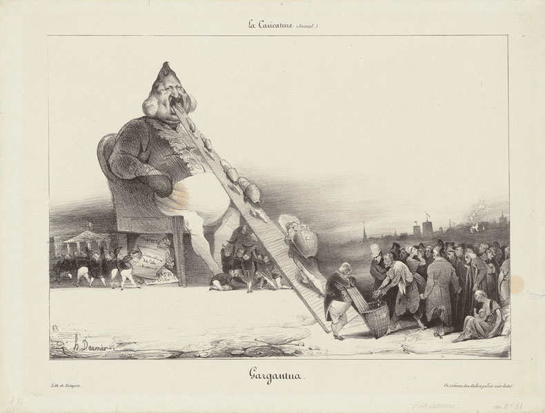 Fortunately, the power of Daumier’s vision emerges undiminished from the six packed rooms of this exhibition. Born in 1808, Daumier was self-taught and spent most of his life producing daily lithographic caricatures as well as droll illustrations of urban life in Paris for political magazines (chiefly Le Charivari, La Silhouette and La Caricature); in later life he displayed his paintings in the Salon. His lithographs had a wide circulation beyond the private sphere of the demi-monde: on the walls of Parisian coffee houses and in shop-window displays in the arcades. While the undeniably popular dimension to his work, with most of his work appearing in periodicals, has somewhat diminished his art-historical stature, Daumier’s gestural economy and mastery of negative space were held in high esteem by contemporaries such as Baudelaire, Manet and Degas. The influence of his work in 20th-century popular culture can meanwhile be sensed in, for instance, the bulging eyes and lolling tongue of Tex Avery’s Big Bad Wolf, Philip Guston’s testicular Nixon drawings and the original run of Spitting Image puppets.