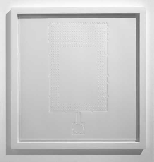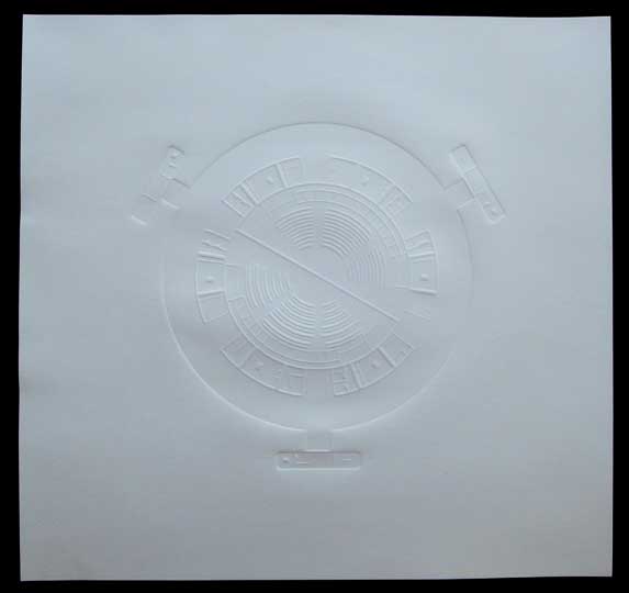 ‘We discovered many artworks which explored the application of pressure in ways which would not usually be considered as printmaking. We chose works which employ and expand upon traditional printmaking techniques and ask questions about what a print can be and do.’ Thus, the first room focuses on the two-dimensional, but considers printmaking expanded into different materials and functions. Richard Long’s photograph A Line Made by Walking records the pressure of his passage, walking up and down a patch of grass, but also makes the process permanent through printing on paper. Five Hour Cloud Drawing by Roger Ackling (who sadly died recently) used sunlight to burn his design into paper, while Langlands and Bell’s two pieces present ghostly building plans, simply embossed into the page.