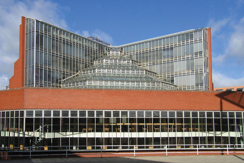 Of the trilogy, the Cambridge building is the hardest to love, lacking the elan of the Leicester engineering department and the compact charm of the Florey. It is a six-storey L-shaped tower containing offices and lecture rooms, said to resemble an open book. In the middle of this L spills a ziggurat of faceted glass, which covers the reading room of the Seeley Library. A neat red-tiled lift tower, a trademark of the trilogy, serves as turret; a glacis and the sunken area that shields the book stacks serve as perimeter defence. All the upward thrust of the tower and the pyramid of glass cannot overcome the weight of the ground-level buildings; where Leicester soars, Cambridge squats; where the Florey encloses, the history faculty sprawls.