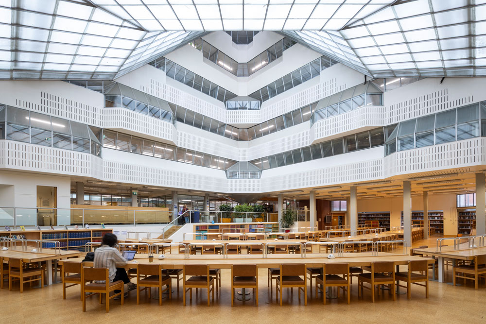 Hopefully future historians will find it a little easier. The building’s original sin was that it was rotated 90 degrees to fit into a slightly smaller site than had originally been allocated. This avoided a more disruptive redesign, but moved the main entrance away from the pedestrian spine of the Sidgwick Site, Cambridge University’s post-war humanities campus at the edge of the city centre, masterplanned by Casson Conder Partnership. More damagingly, the library glasshouse was turned towards the south, and the sun.