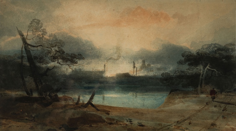 Such comparisons are not always unflattering. John Sell Cotman’s Bedlam Furnace at Coalbrookdale(c. 1802) on display at the Towner, in which a sunrise silhouettes the stacks of an iron forge in Coalbrookdale, anticipates later industrial studies, such as Turner’s Dudley, Worcestershire (c. 1830–33), held in the Walker. In both, the rays of a new dawn are like X-rays irradiating the foreground; in Bedlam Furnace, they render a tree’s broken trunk as translucent as its leaves. Curatorial guidance at the Towner is minimal and, moving through the exhibition as a whole, the viewer feels distinctions between Turner and his contemporaries hardening and softening as new comparisons are introduced. While it is not finally clear what the curators of this exhibition take Turner’s singular contribution to be, perhaps unsettling persistent assumptions about the distinctiveness of this artist is the point.