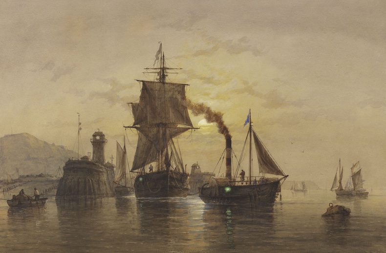 However, across the three rooms that comprise the exhibition, the strength of the Towner’s holdings, bolstered by loans from a private collection, lies in works by Turner’s contemporaries. Indeed, Turner is little seen until the final room. This is no bad thing, since it enables the curators to tell a story about Turner’s artistic milieu. His nearly abstract seascapes can be tested against those of his imitators and inheritors. For instance, Henry George Hine’s Colliers Unloading by Moonlight at Eastbourne (1883) is as interested in light as any Turner work while possessing a dreamy stasis that makes clear Turner’s genius for drawing movement and energy out of comparable materials. Or compare Richard Henry Nibbs’s Newhaven (n.d.), which replicates the subject and composition of The Fighting Temeraire (1839) but gives it the fastidiously representational burnish of a maritime genre painter.