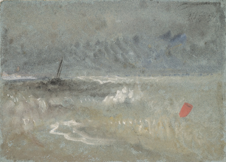 ‘Impressions in Watercolour: J.M.W. Turner and his Contemporaries’, which opened at the Holburne Museum in May and is now at the Towner, with some variations, is billed as an opportunity to view Turner at ‘his most experimental and gestural’. At times it is. In A Boat near a Buoy in a Rough Sea (c. 1830), the dark splodge of the titular boat barely frees itself from the blue of the paper on which it is painted, pushing hard against the limits of representational painting. If the intense red of the buoy at bottom right, painted in gouache, marks shallows or wreckage, its primary purpose for the viewer is to ward off pure abstraction.
