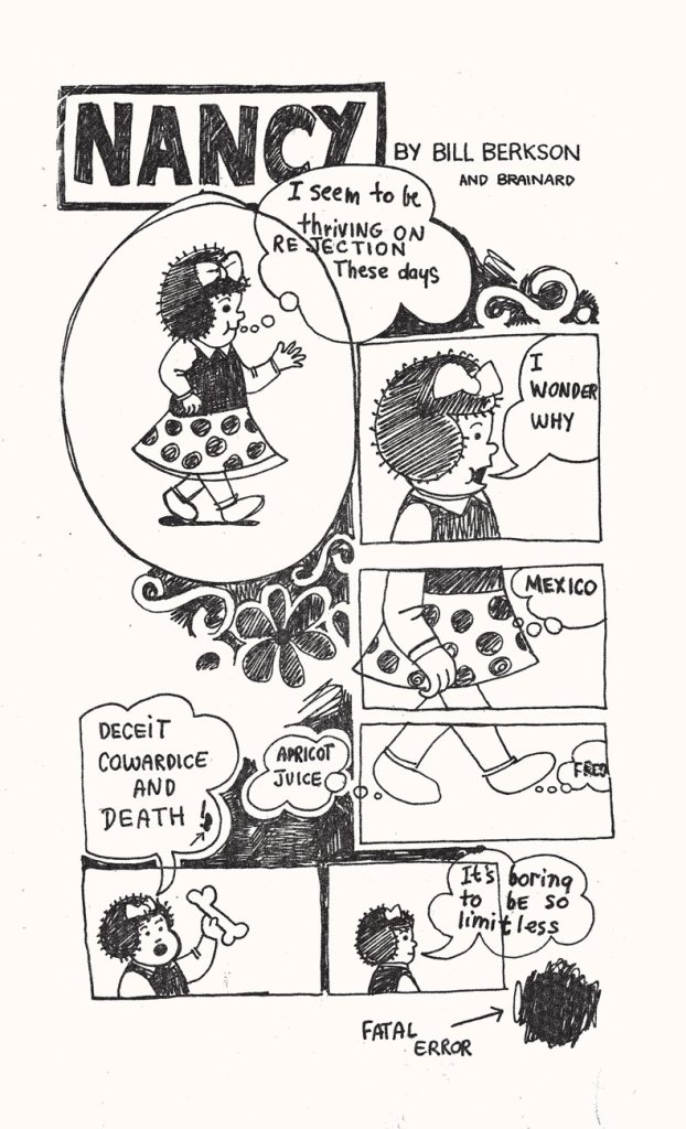 One of the two solo Brainard pieces in this collection is ‘People of the World: RELAX!’ In eight pages he contrives to relieve many anxieties which still plague us today: tight pants, masturbation in the shower, smoking, making noise in the toilet and wanting to be a movie star or a dancer. Death: it will not hurt you. ‘PEOPLE OF THE WORLD: RELAX!’ One would so like to.